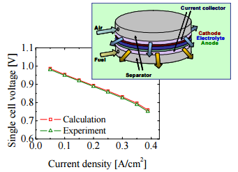 現在脚光を浴びている固体高分子形燃料電 池(PEFC)よりも発電効率の高い次世代型燃 料電池である固体酸化物形燃料電池(SOFC) の数値シミュレーションコードの開発を行っ ている。開発したコードによる計算結果は実 験結果とよく一致しており,その研究開発用 の強力なツールとしての使用が期待できる。
